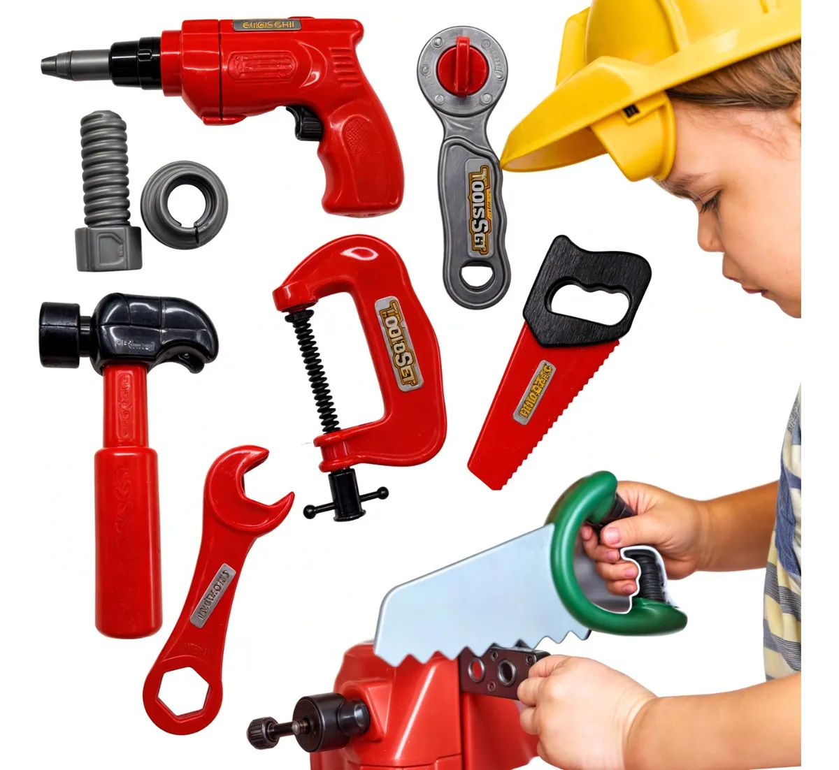Ferramentas Diversificadas: Inclui martelo, chave de fenda, serrote, alicate e régua, todos em tamanhos perfeitos para mãos pequenas.